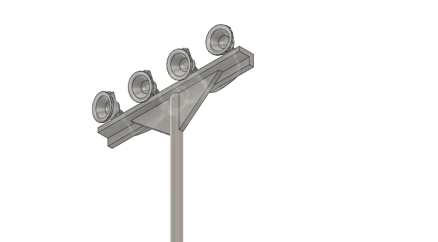 Der Mast hat eine Reale Höhe von ca. 2,50m, auf dem Mast sind 4 Suchscheinwerfer installiert, welche in unterschiedlich Richtungen leuchten.