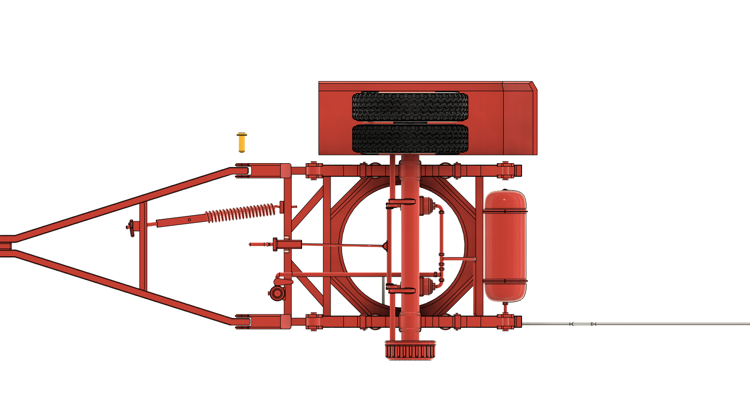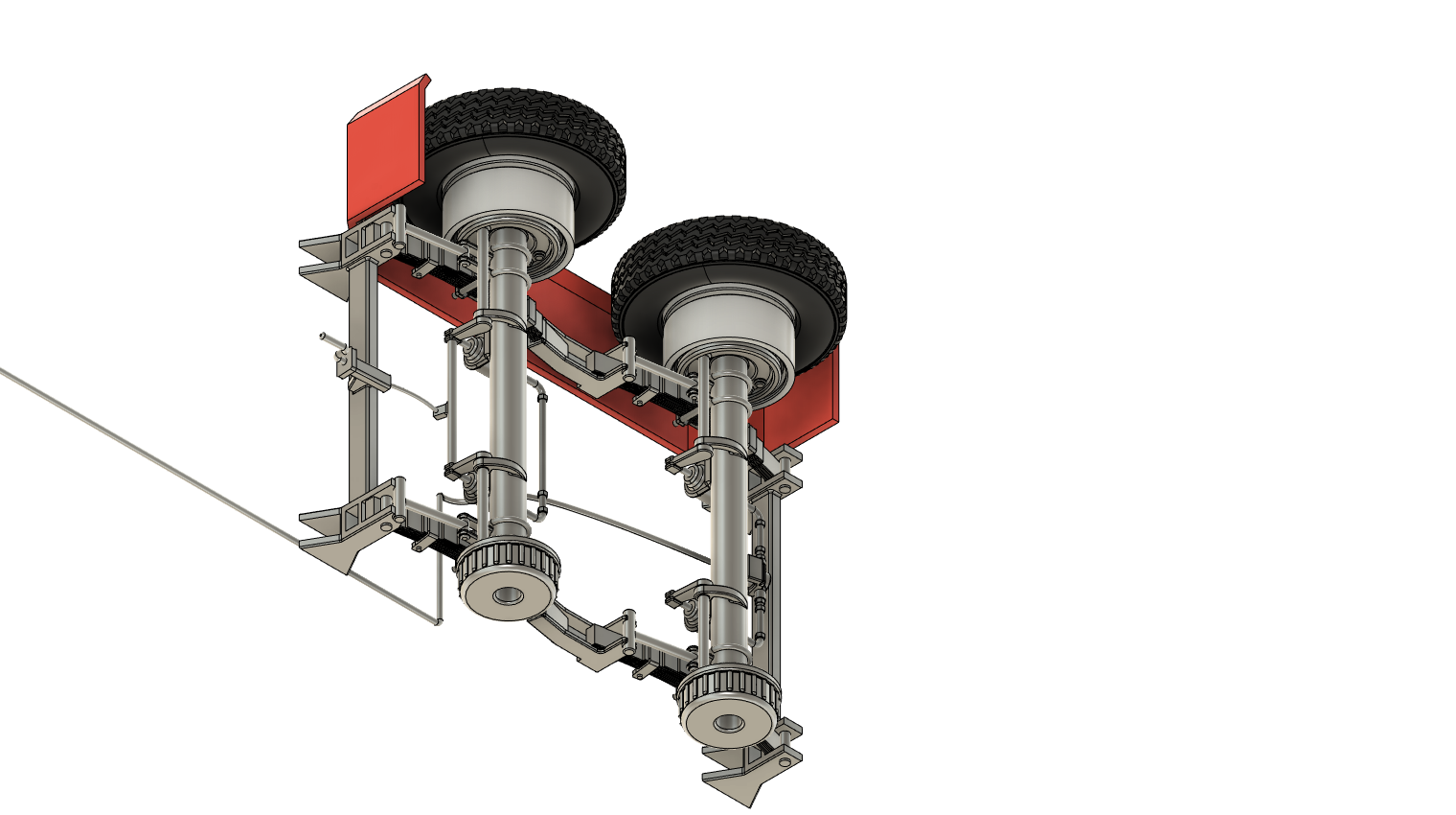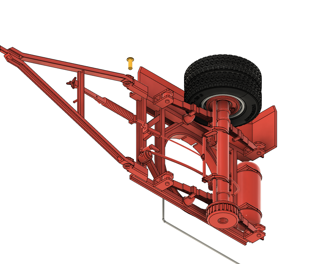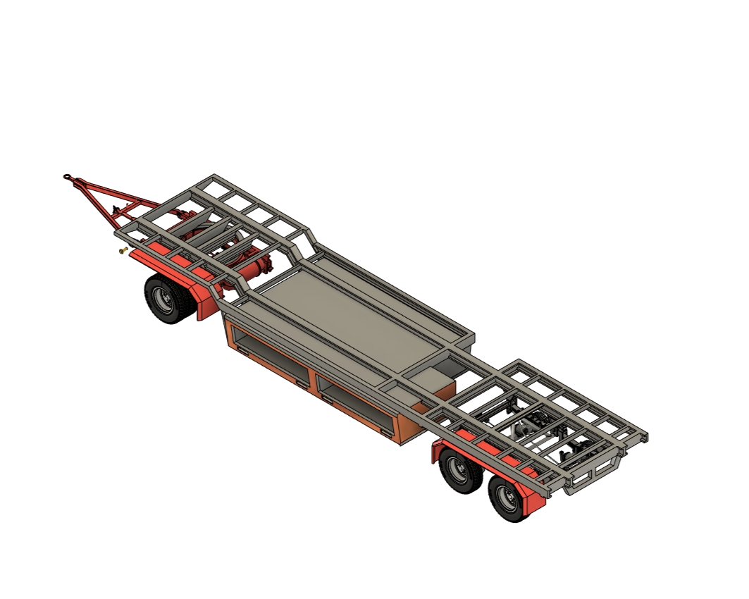 Der Drehkranz ist ein HW80 Drehkranz, welcher nach vorn verlängert worden ist, Achsen vorn und hinten sind ebenfalls vom HW80. Das größte Problem bei dem Anhänger war die Tandemachse hinten, wir haben uns für den Achsaufbau des HLS 200 entschieden, und die Achsgruppe den Hänger angepasst.