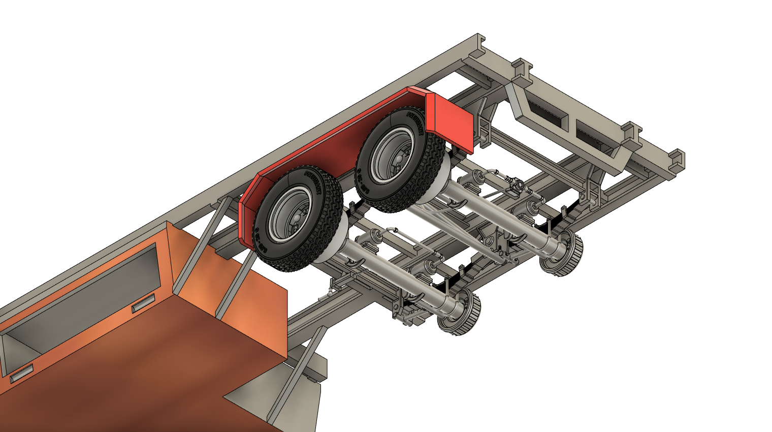 Der Anhänger ist 12Fach bereift, d.h. komplett Zwillingsräder, mit einer Reifengröße 6.00-20C. Die Räder sind nicht beweglich. Die Achsen sind hochdetailliert, mit Bremstrommel, Bremsgestänge, Luftleitungen Bremsseilen etc. Reifengröße und Marke steht auf dem Reifen.
